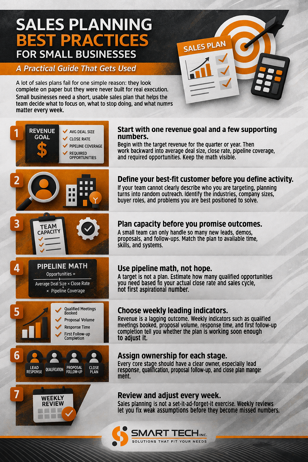 7. Review and adjust every week. Sales planning is not a set-it-and-forget-it exercise. Weekly reviews let you fix weak assumptions before they become missed numbers.